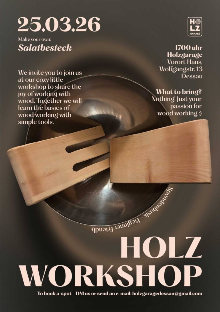 Am Freitag finden in regelmäßigen Abständen von 16 bis 19 Uhr Workshops statt. Dafür suchen wir verschiedene Leute aus Dessau-Roßlau und Umgebung, die etwas Besonderes können und ihre Fähigkeiten an andere weitergeben möchten. Ob vom Messerschleifen über Siebdruck bis zur Schmuckherstellung, wir bieten euch abwechslungsreiche Kurse an.